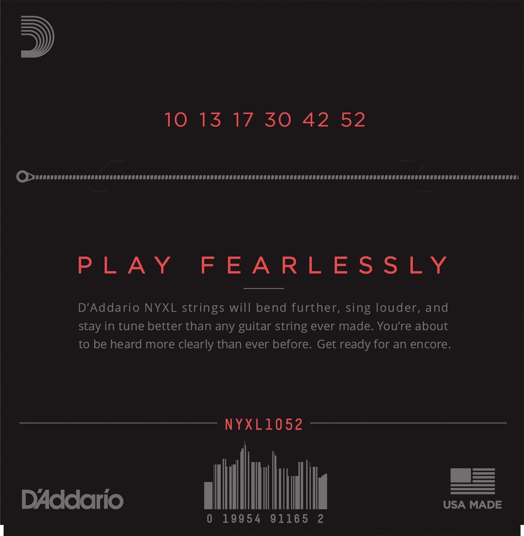 NYXL1052 is a hybrid set, combining the high strings from an regular light set (.010) with heavier low strings (.052). This combination delivers powerful low end for heavy chording and flexible plain steel strings for bending.