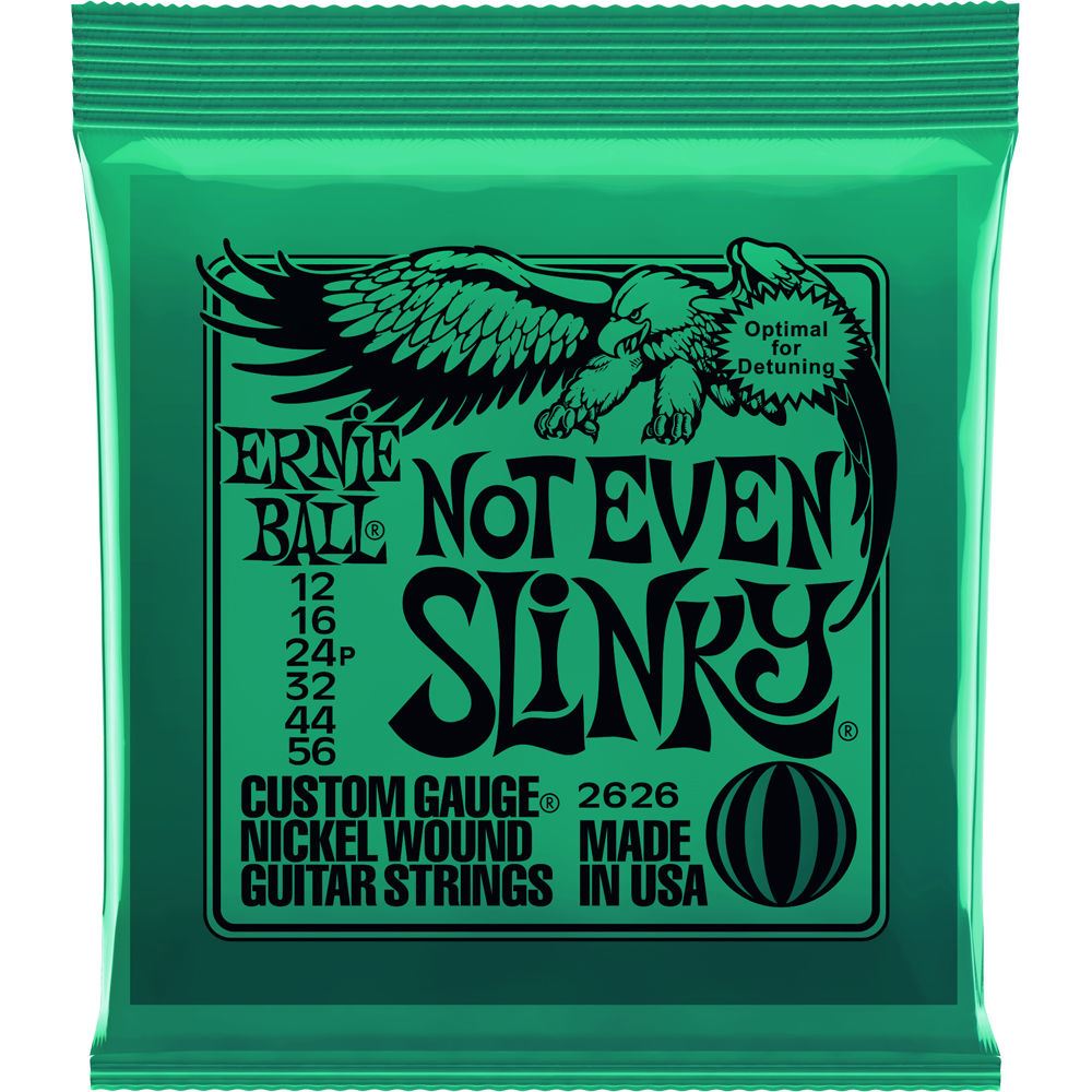 Optimal For Detuning. Ernie Ball Not Even Slinky Electric Strings are perfect for those who like to detune their instrument to lower tuning combinations. Metal fans worldwide have gravitated towards the Not Even Slinky set to give their guitar the optimal gauge combination for Drop D amp Drop C tuning. These strings are precision manufactured to the highest standards and most exacting specifications to ensure consistency, optimum performance, and long life. Not Even Slinky wound strings are made from nickel plated steel wire wrapped around a hex shaped steel core wire. The plain strings are made of specially tempered tin plated high carbon steel producing a well balanced tone for your guitar