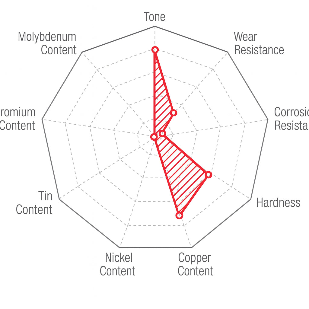Made from a copper alloy of 92.5% copper and 7.2% tin, phosphor bronze fretwire delivers a noticeably warmer tone compared to traditional nickel silver. Its hardness sits between 18% and 36% nickel silver, making it durable yet easier to work with than harder alloys.