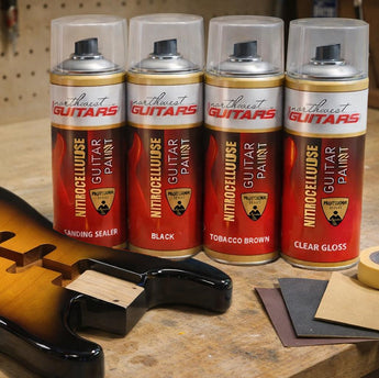 This kit contains everything required to apply a traditional 3-colour sunburst nitrocellulose finish to a guitar or bass body, using compatible products in the correct sequence. It’s designed to remove the guesswork from selecting individual aerosols and to ensure consistent results from surface preparation through to final clear coat.