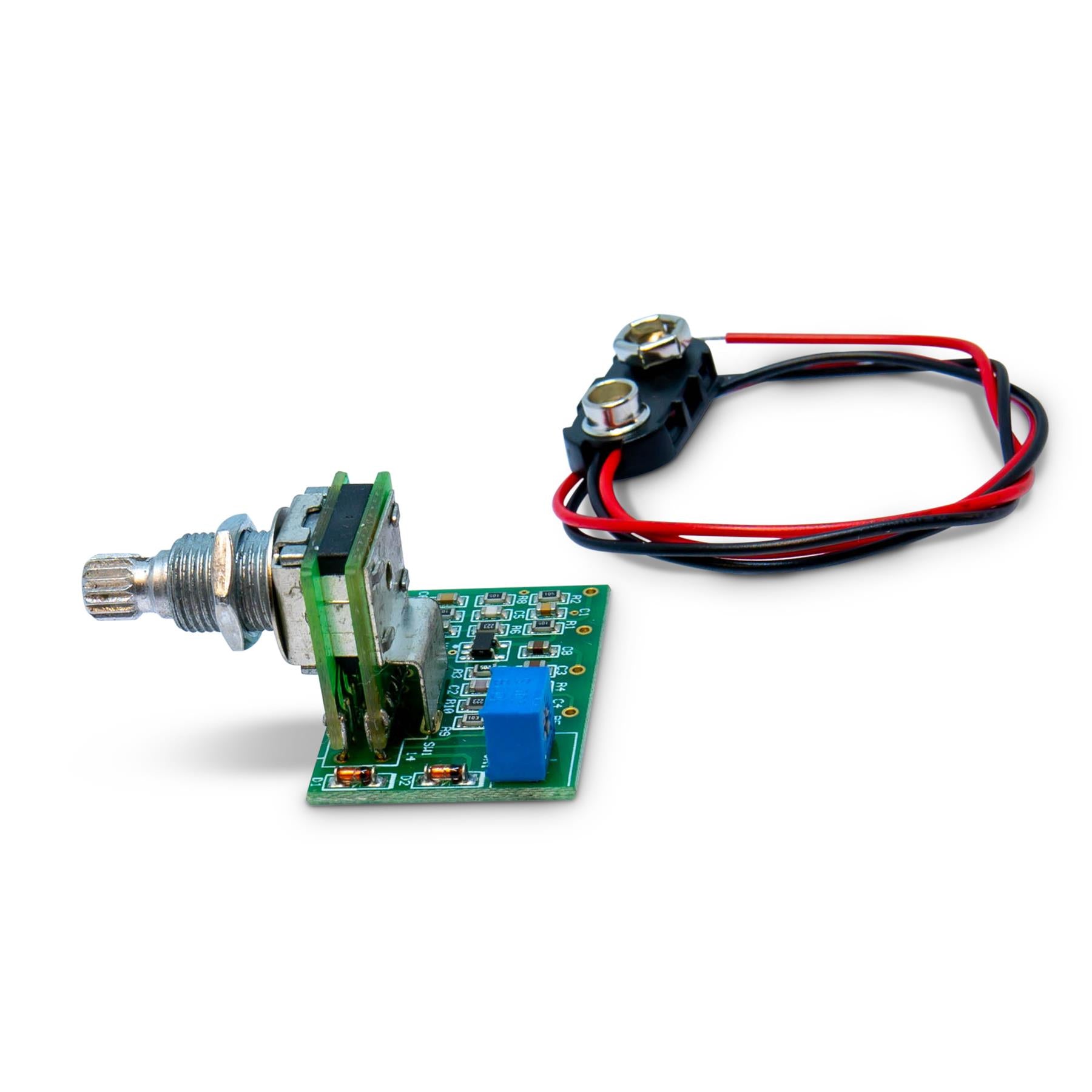 The board is powered by a 9V battery (not included) and the will last around 3000 hours of continuous use due to the simplicity of the circuit. Installation is simple and carries with it the advantage of reducing noisy cables in your signal chain.