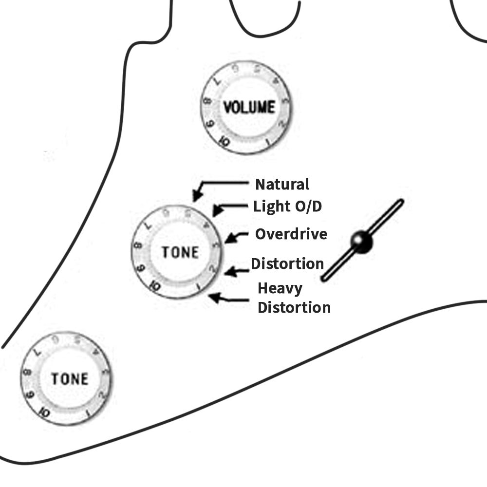 There are 4 distortion tones on offer with Clean Boost, Blues Overdrive, Rock Distortion and Heavy Metal covering the spectrum of guitar tone. There is also a passive bypass position which allows your original guitar tone to come through uncoloured. It's like having an overdrive pedal and tube amp built directly into your guitar.