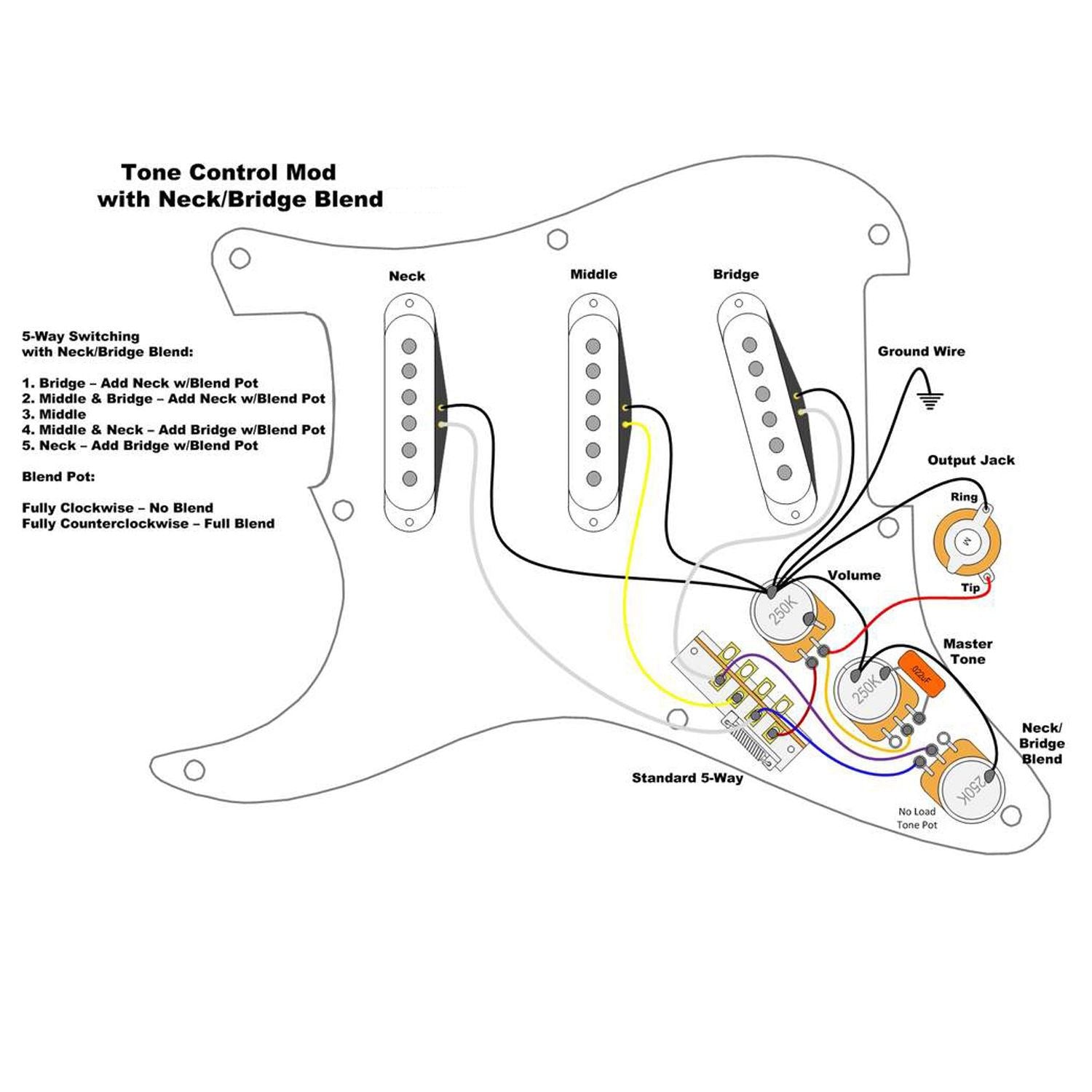 A Standard 5-Way Strat has 1 volume and 2 tones. The Blender wiring has 1 volume, 1 master tone, and a Blender pot. In the neck position you can blend the bridge pickup in as much as you want. In the bridge position you can blend the neck pickup in as much as you want. In positions 2 and 4 you can have all three pickups on at once. No drilling extra holes for toggle switches or push/pull pots.