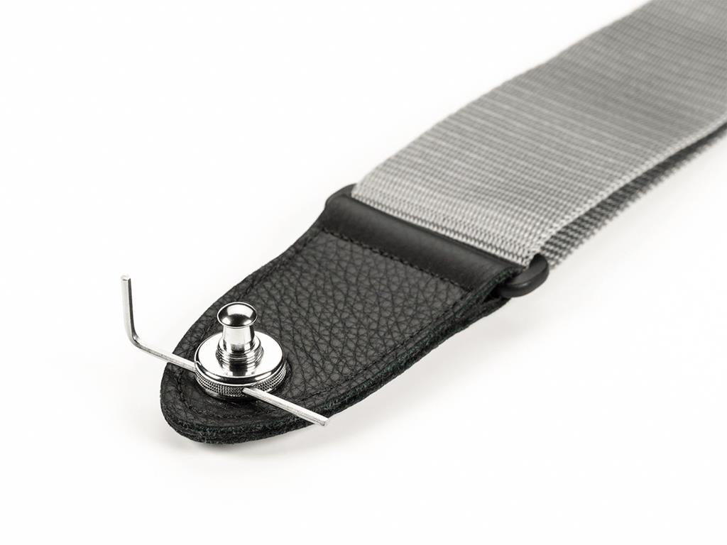 The system replaces your standard strap buttons with hardened steel locking buttons and uses an adjustable strap holder to fit different strap thicknesses. A patented Lock-Wheel with triple security prevents accidental release, even during aggressive playing.