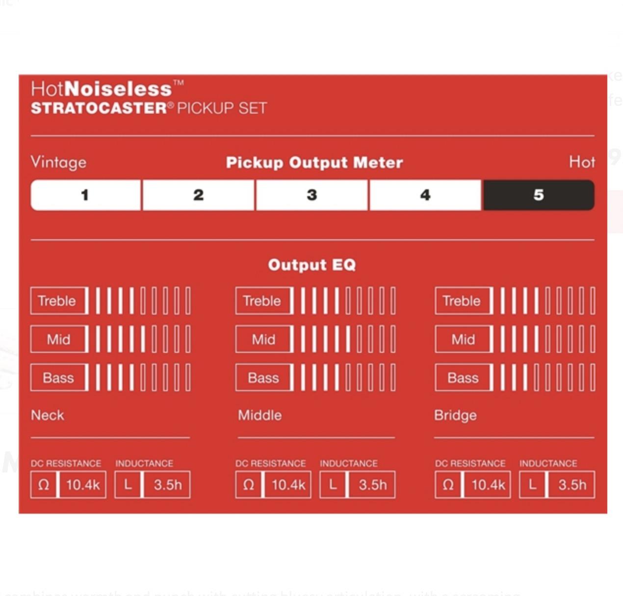 Fender Hot Noiseless Strat pickups exude tone that combines warmth and punch with cutting bluesy articulation, with a screaming high-gain bridge pickup. And thanks to Fender's state-of-the-art Noiseless design, the clean, full sound is free of hum.