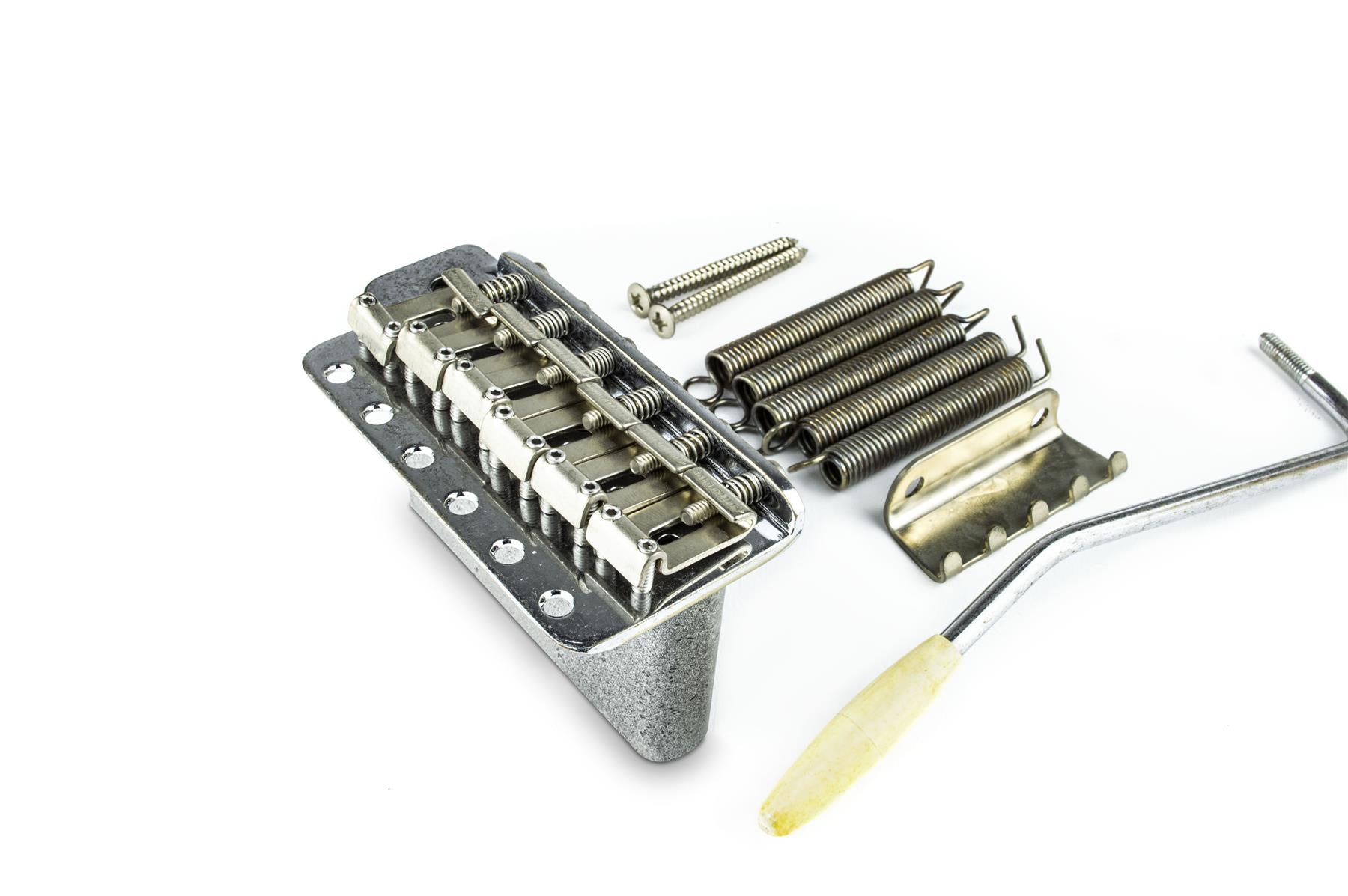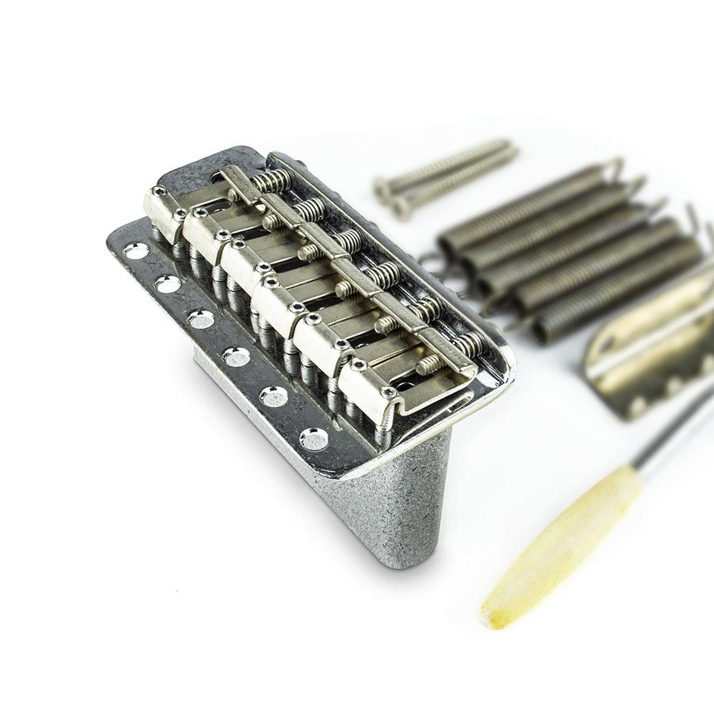 Full bridge system includes pivot screws, tremolo arm, springs, spring claw and screws