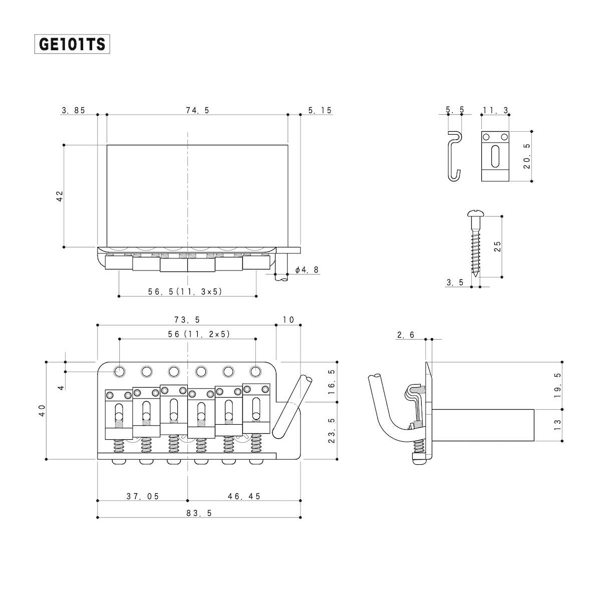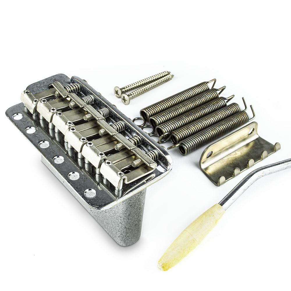 The Gotoh GE101TS tremolo has the wide string and screw hole spacing of vintage Fender Stratocasters (2 7/32") giving you the classic look and feel of a six pivot screw tremolo system with Gotoh quality manufacturing. This bridge features traditional bent sheet steel saddles for clarity and response with a solid steel sustain block. The tremolo arm and all mounting hardware is included.