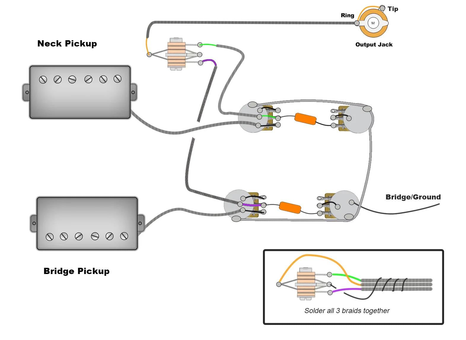 The switch is wired with durable “Gibson-style” braided cloth wire, with heat shrink tubing around the solder joints for added insulation and reliability. It features three lead wires—two connect to the volume pots, while the third connects to the output jack.