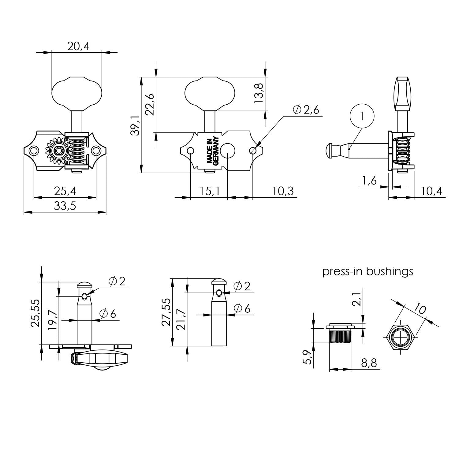 Only original Schaller GrandTune bushings should be used. The inner diameter is precisely machined for 6.0 mm posts to maintain correct worm gear alignment. Using bushings with a larger inner diameter can lead to premature worm gear wear.